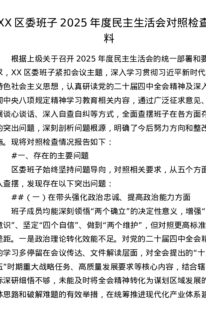XX区委班子2025年度xxxxx对照检查材料(5958字)