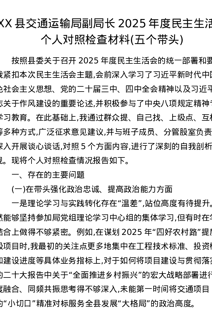 XX县交通运输局副局长2025年度xxxxx个人对照检查材料(五个带头)