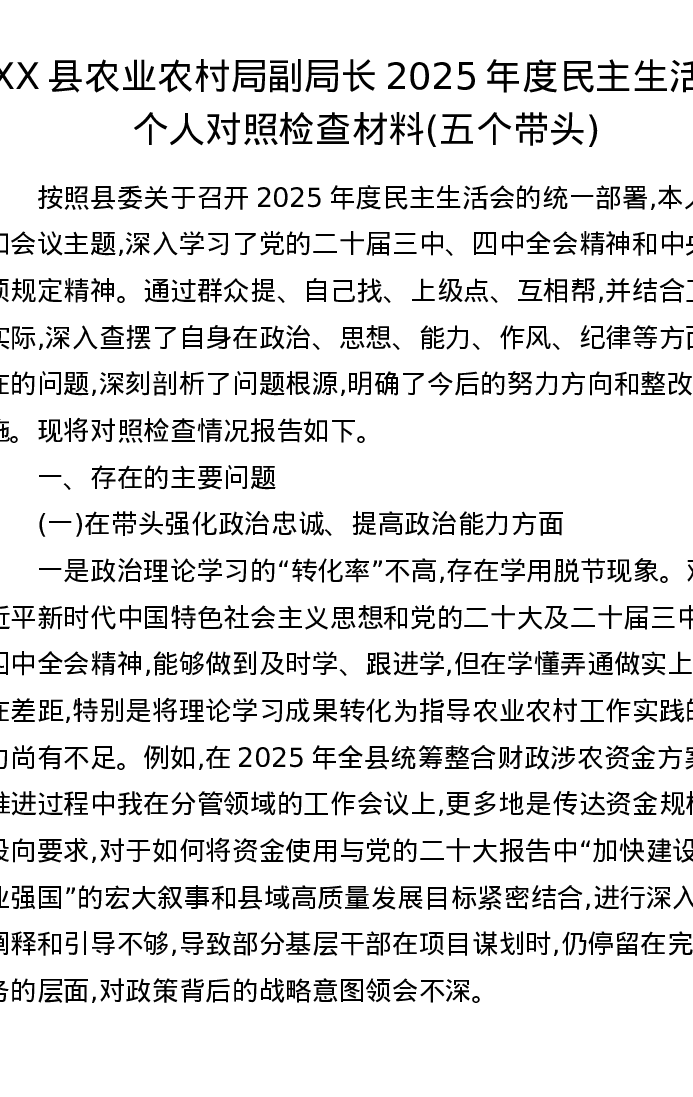 XX县农业农村局副局长2025年度xxxxx个人对照检查材料(五个带头)