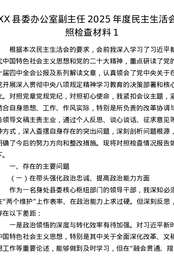 XX县委办公室副主任2025年度xxxxx对照检查材料1