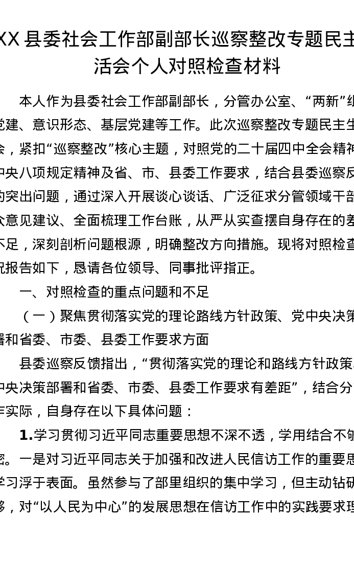 XX县委社会工作部副部长巡察整改专题xxxxx个人对照检查材料1
