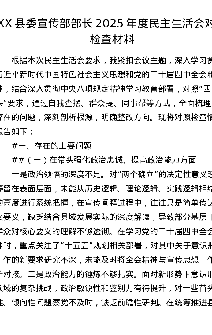 XX县委宣传部部长2025年度xxxxx对照检查材料(5912字)