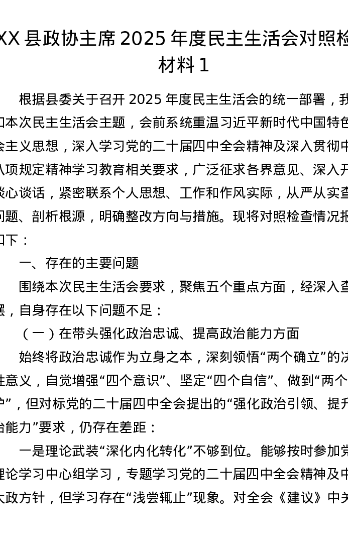 XX县政协主席2025年度xxxxx对照检查材料1