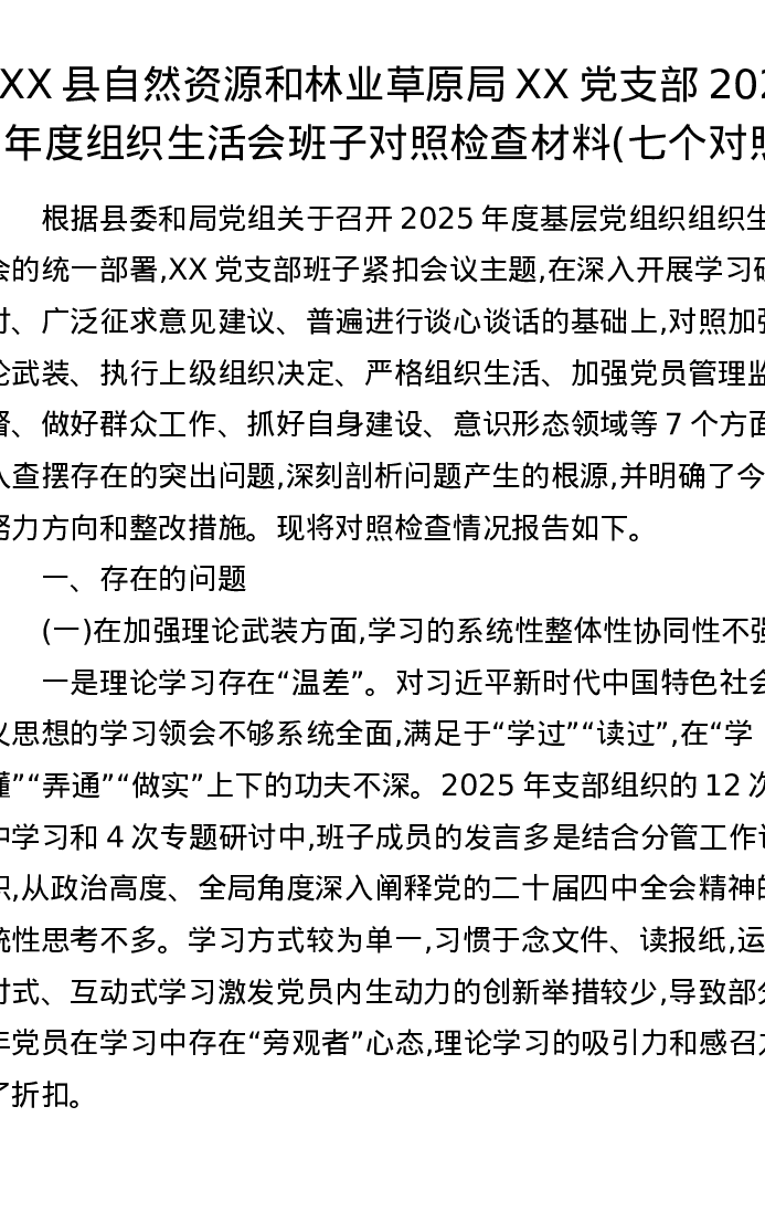 XX县自然资源和林业草原局XX党支部2025年度组织xxx班子对照检查材料(七个对照)