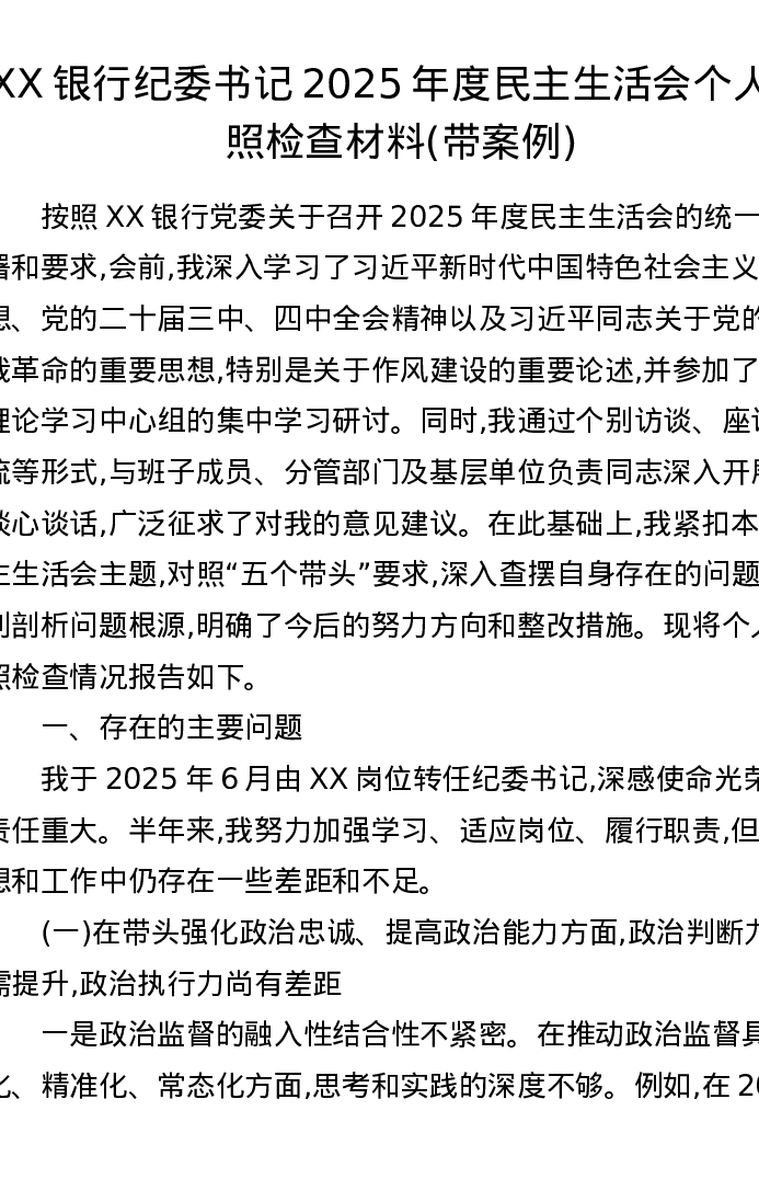 XX银行纪委书记2025年度xxxxx个人对照检查材料(带案例)