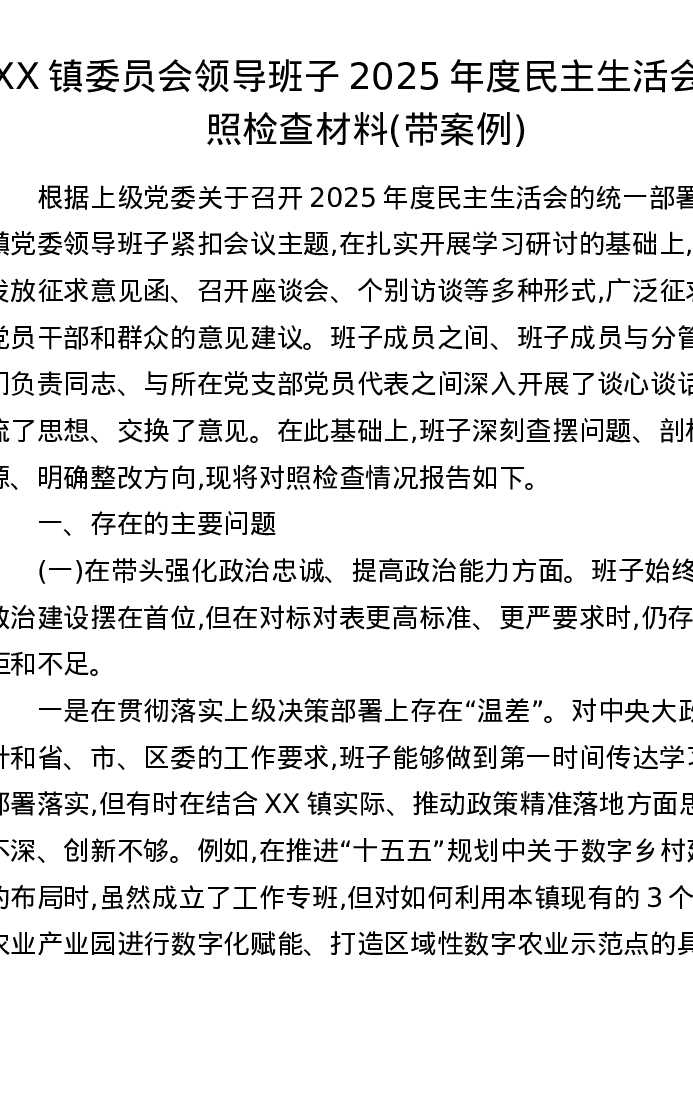 XX镇委员会领导班子2025年度xxxxx对照检查材料(带案例)