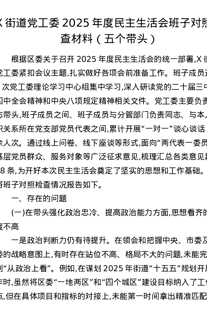 X街道党工委2025年度xxxxx班子对照检查材料(五个带头)