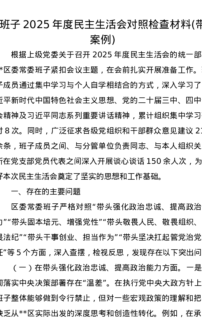 班子2025年度xxxxx对照检查材料(带案例)