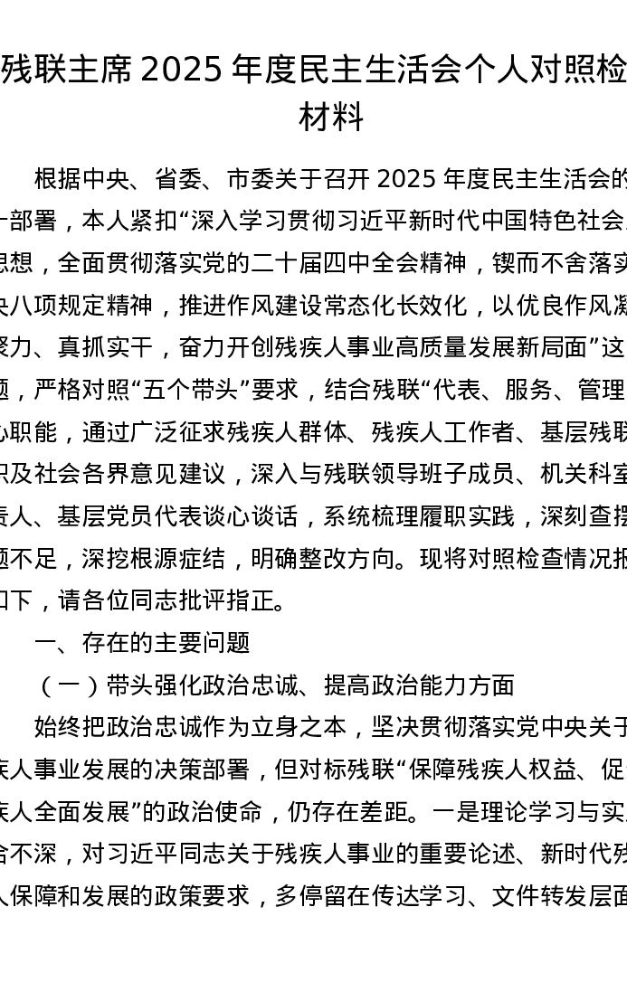 残联主席2025年度xxxxx个人对照检查材料