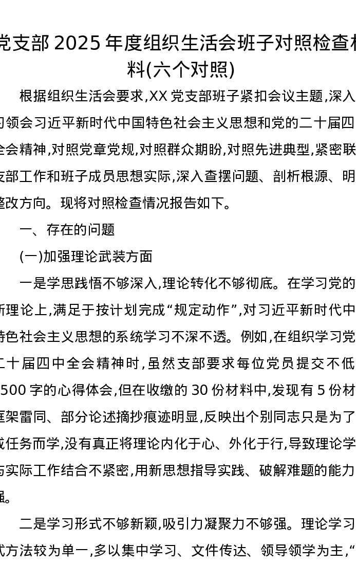 党支部2025年度组织xxx班子对照检查材料(六个对照)