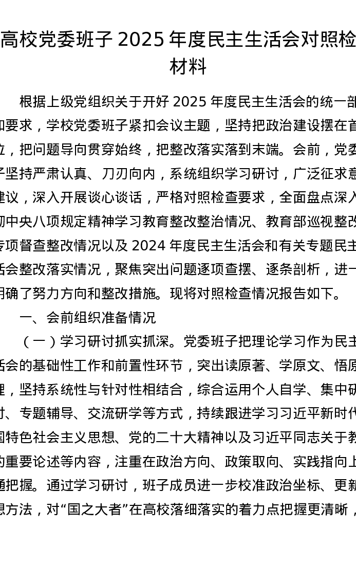 高校党委班子2025年度xxxxx对照检查材料(6800字)