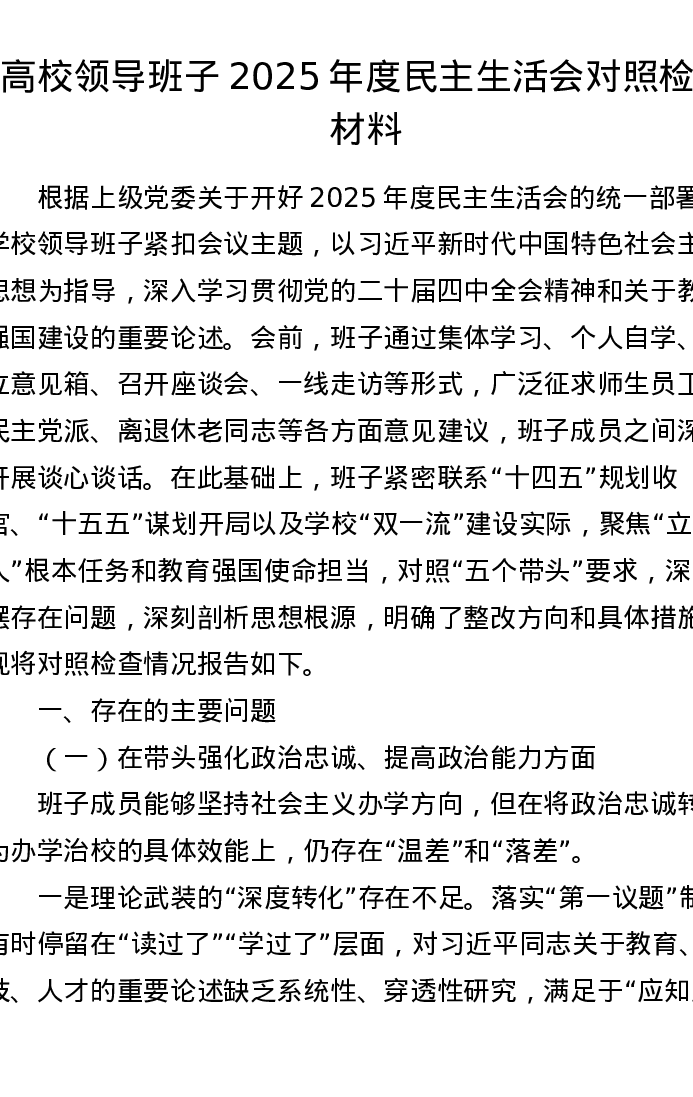 高校领导班子2025年度xxxxx对照检查材料(3918字)