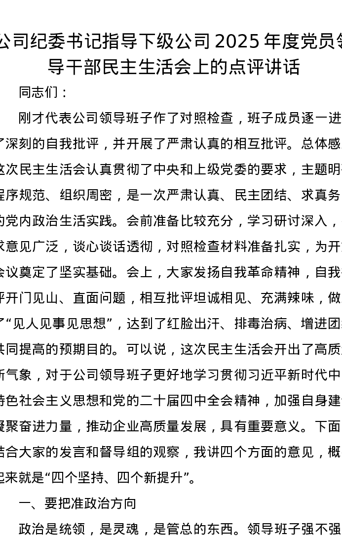 公司纪委书记指导下级公司2025年度党员领导干部xxxxx上的点评讲话