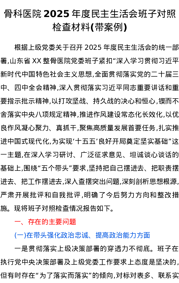 骨科医院2025年度xxxxx班子对照检查材料(带案例)