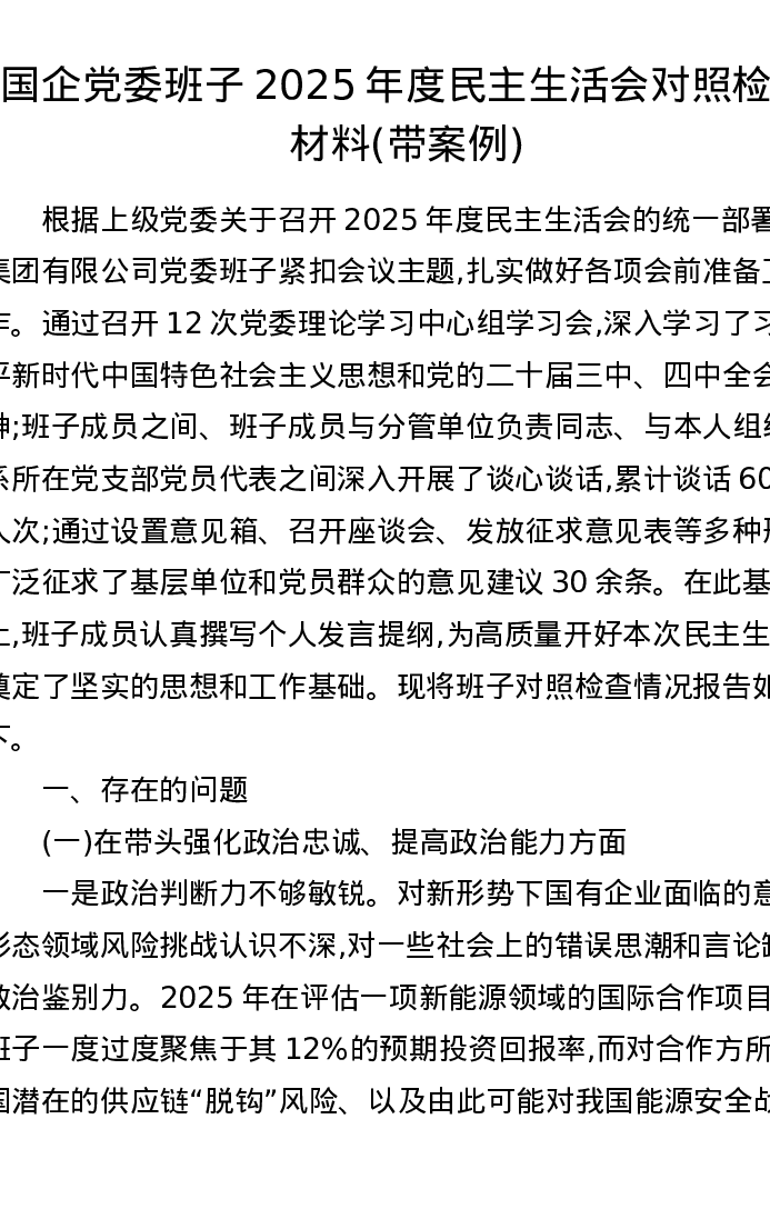 国企党委班子2025年度xxxxx对照检查材料(带案例)