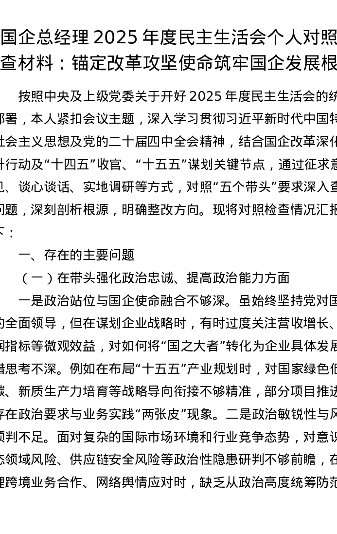 国企总经理2025年度xxxxx个人对照检查材料:锚定改革攻坚使命 筑牢国企发展根基