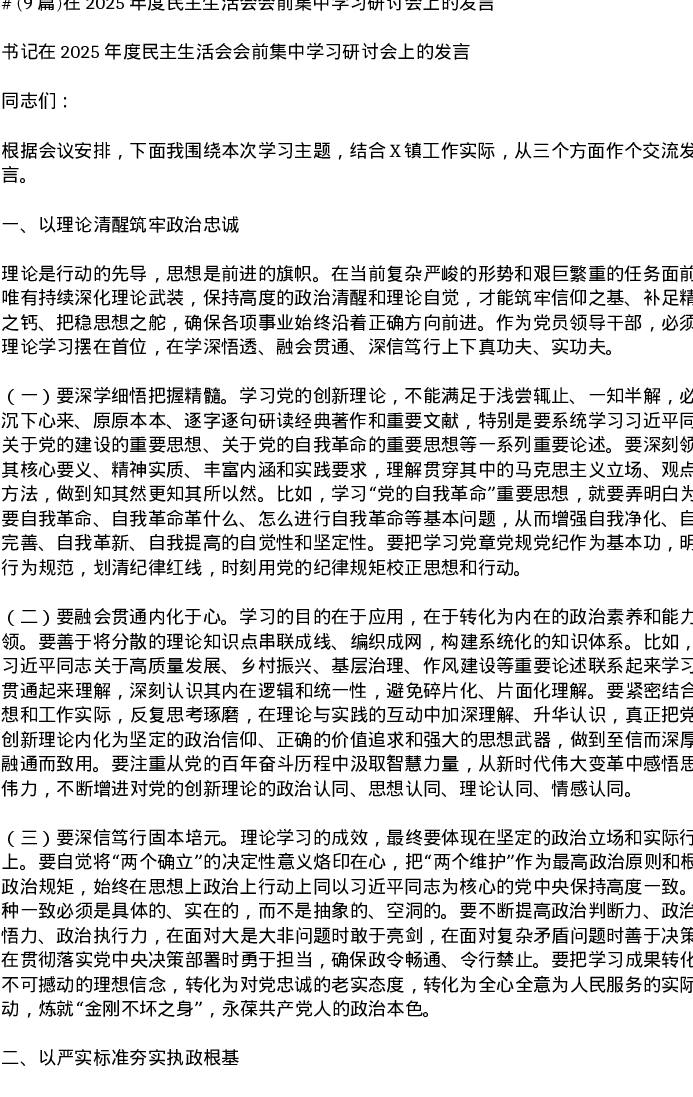 汇编:在2025年度xxxxx会前集中学习研讨会上的发言9篇