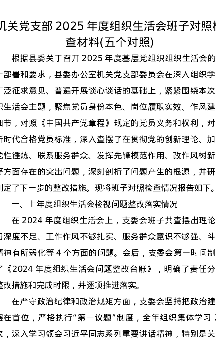 机关党支部2025年度组织xxx班子对照检查材料(五个对照)