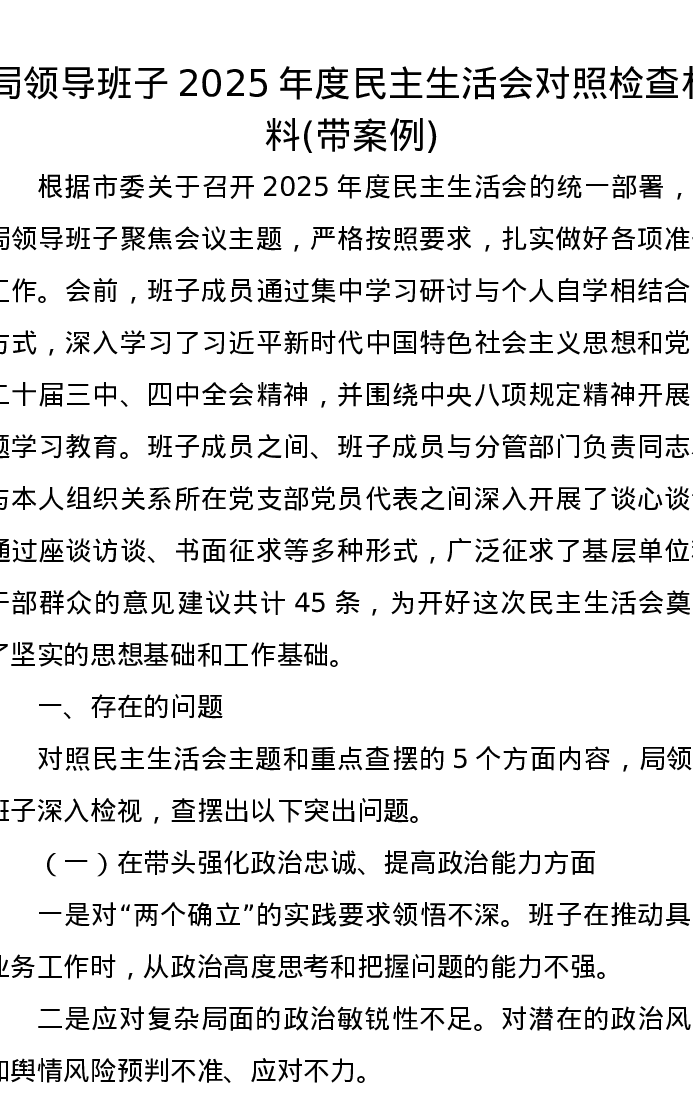 局领导班子2025年度xxxxx对照检查材料(带案例)