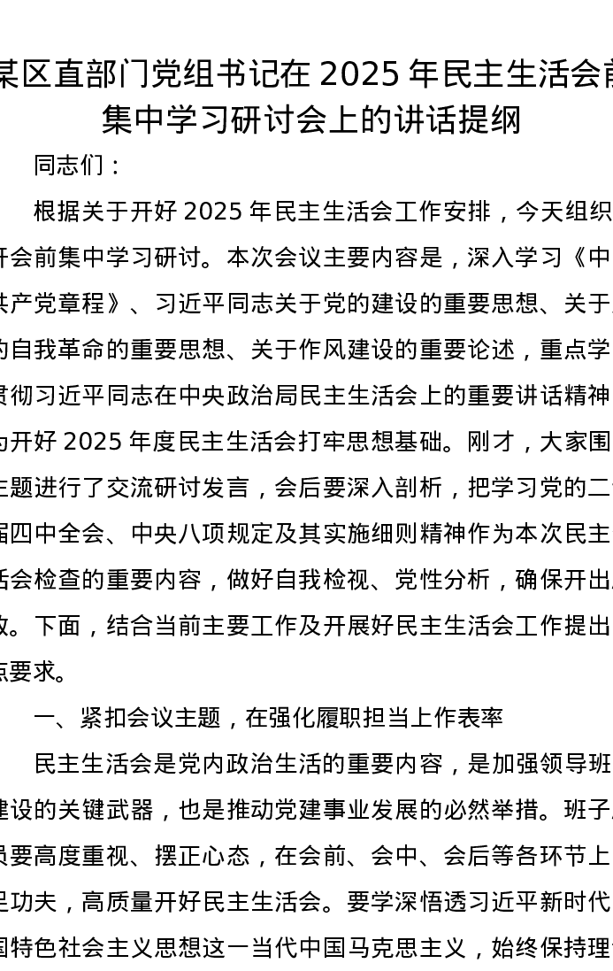 某区直部门党组书记在2025年xxxxx前集中学习研讨会上的讲话提纲