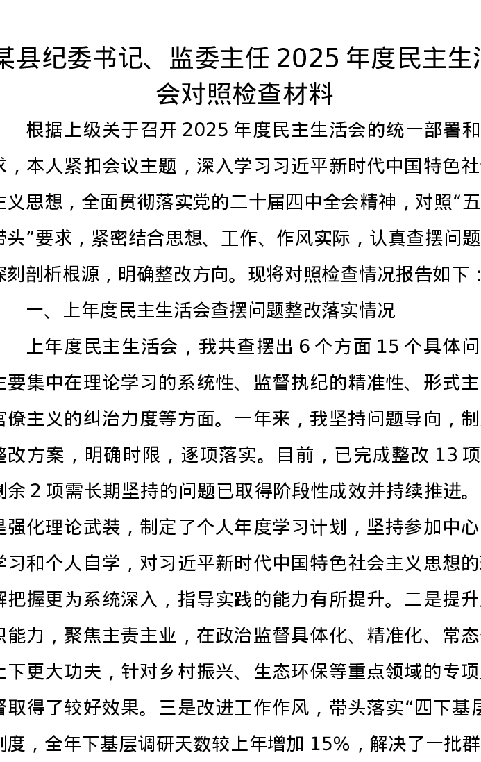 某县纪委书记、监委主任2025年度xxxxx对照检查材料