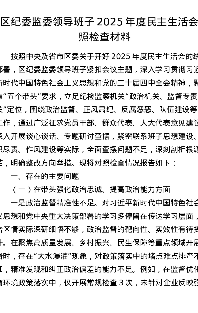 区纪委监委领导班子2025年度xxxxx对照检查材料—锚定监督使命 深化正风反腐 勇担护航发展重任
