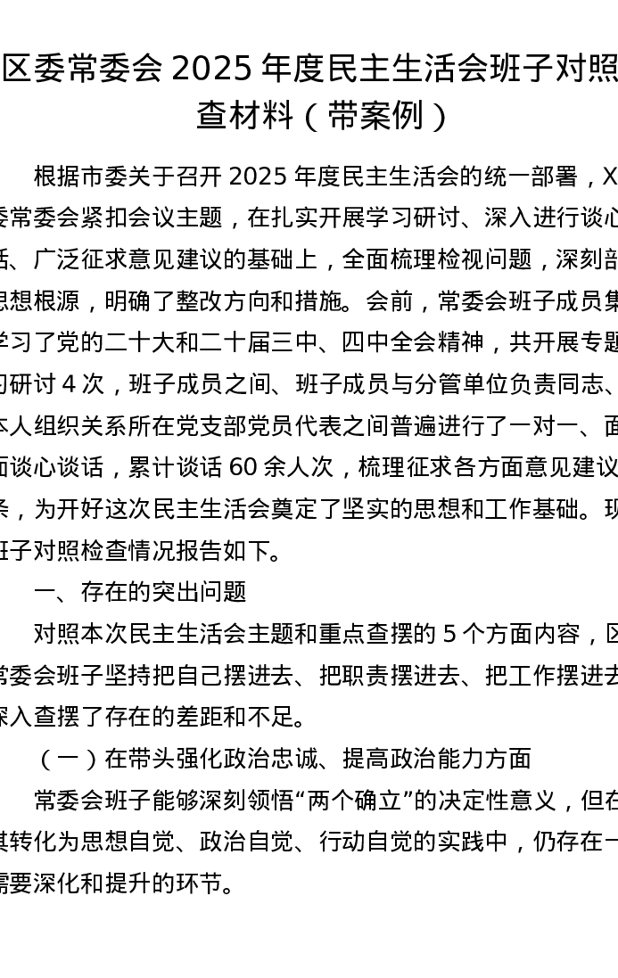 区委常委会2025年度xxxxx班子对照检查材料(带案例)