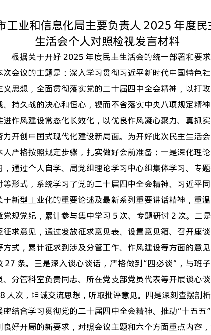 市工业和信息化局主要负责人2025年度xxxxx个人对照检视发言材料