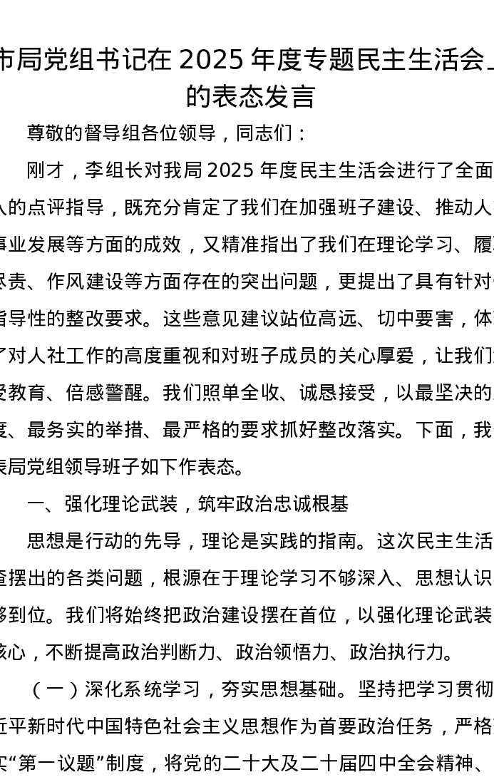 市局党组书记在2025年度专题xxxxx上的表态发言
