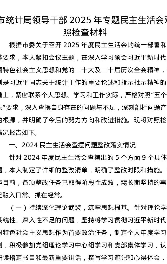市统计局领导干部2025年专题xxxxx对照检查材料