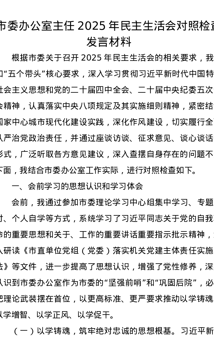 市委办公室主任2025年xxxxx对照检查发言材料