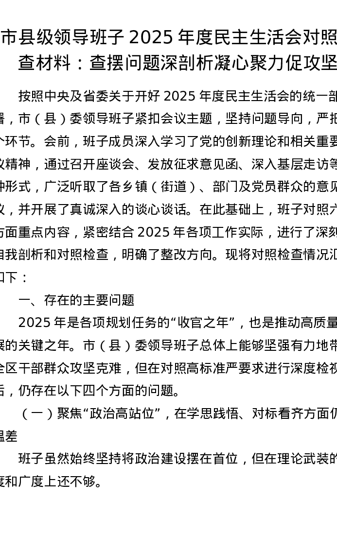 市县级领导班子2025年度xxxxx对照检查材料:查摆问题深剖析 凝心聚力促攻坚