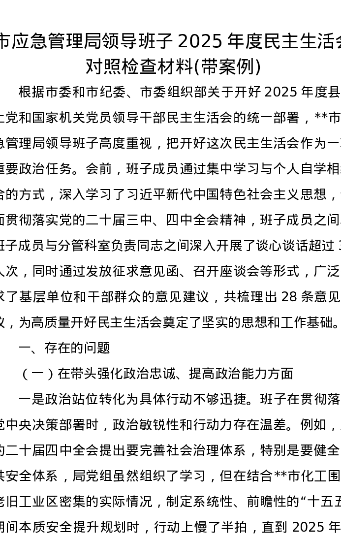 市应急管理局领导班子2025年度xxxxx对照检查材料(带案例)