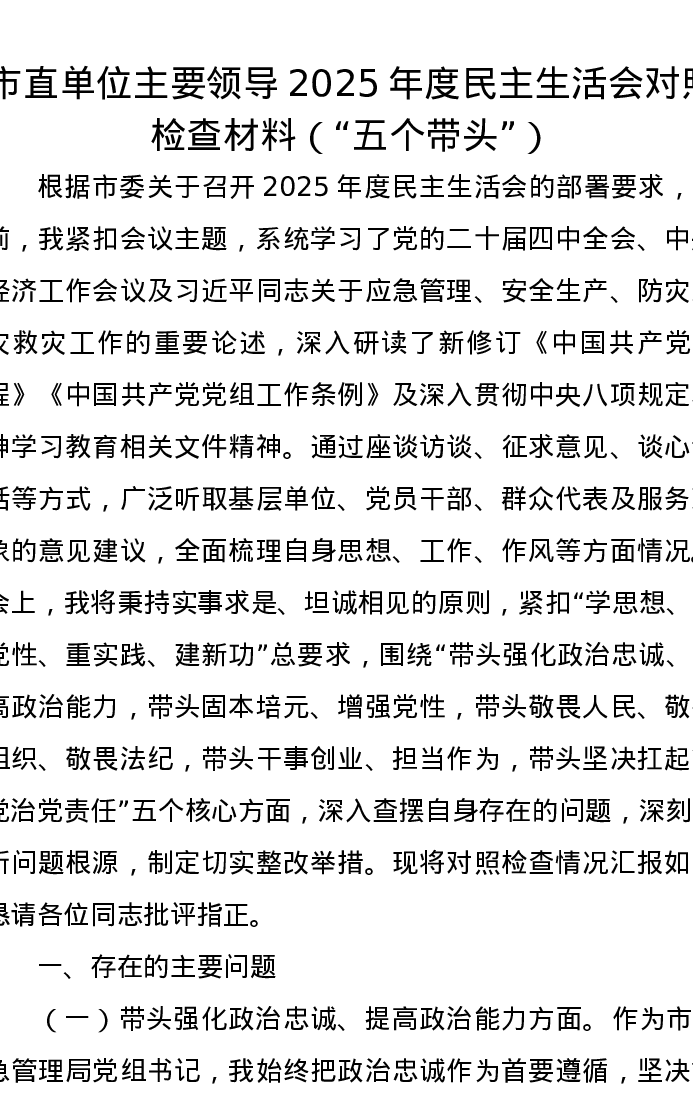 市直单位主要领导2025年度xxxxx对照检查材料(五个带头)