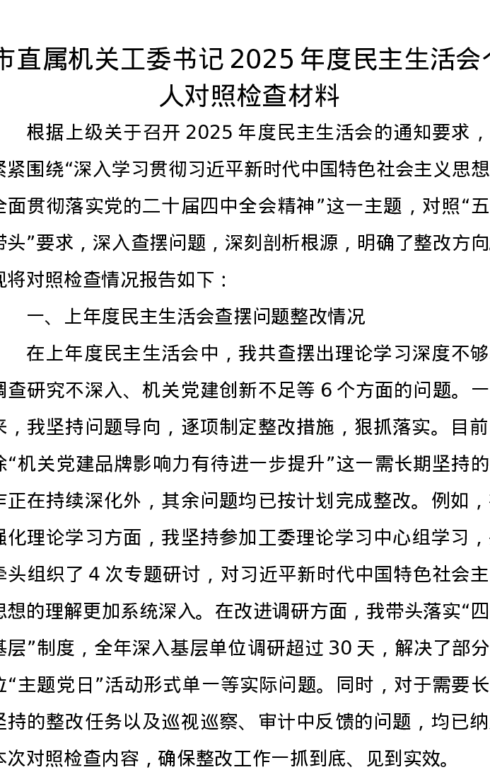 市直属机关工委书记2025年度xxxxx个人对照检查材料