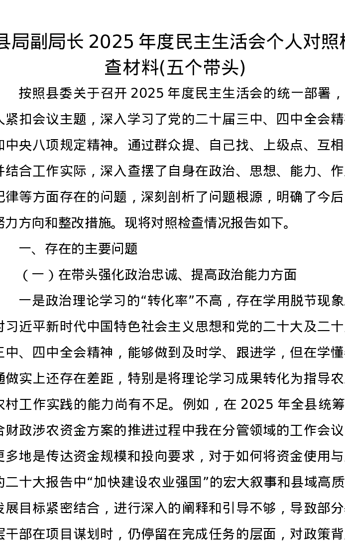 县农业农村局副局长2025年度xxxxx个人对照检查材料(五个带头)