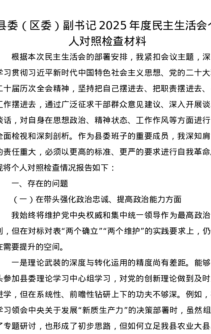 县委(区委)副书记2025年度xxxxx个人对照检查材料
