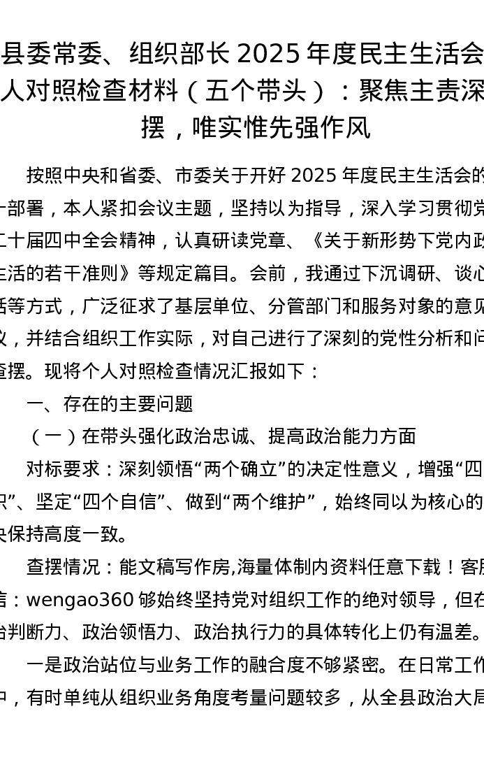 县委常委、组织部长2025年度xxxxx个人对照检查材料(五个带头):聚焦主责深查摆,唯实惟先强作风