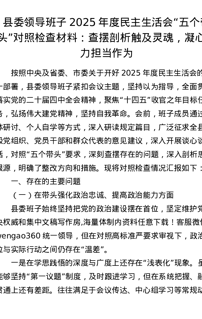 县委领导班子2025年度xxxxx五个带头对照检查材料:查摆剖析触及灵魂,凝心聚力担当作为