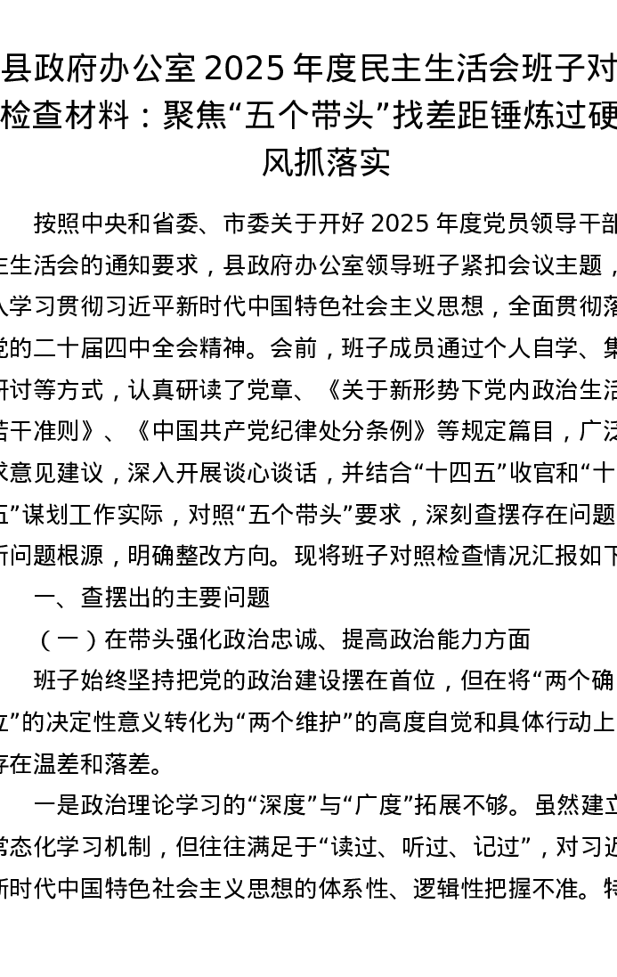 县政府办公室2025年度xxxxx班子对照检查材料:聚焦五个带头找差距 锤炼过硬作风抓落实