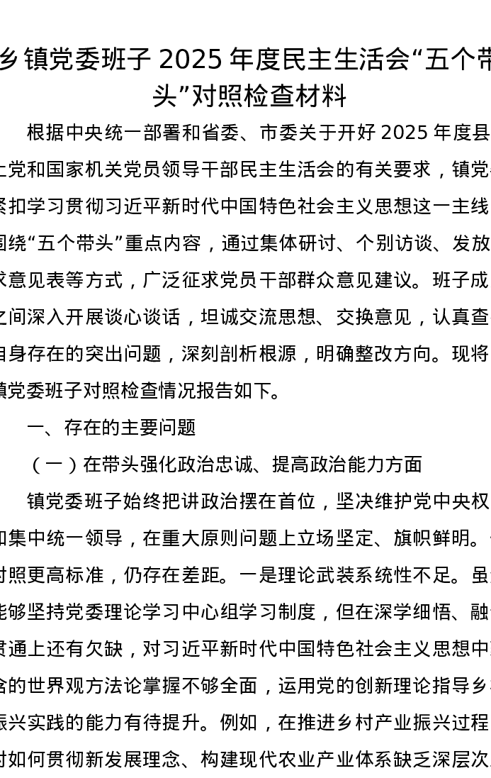 乡镇党委班子2025年度xxxxx五个带头对照检查材料