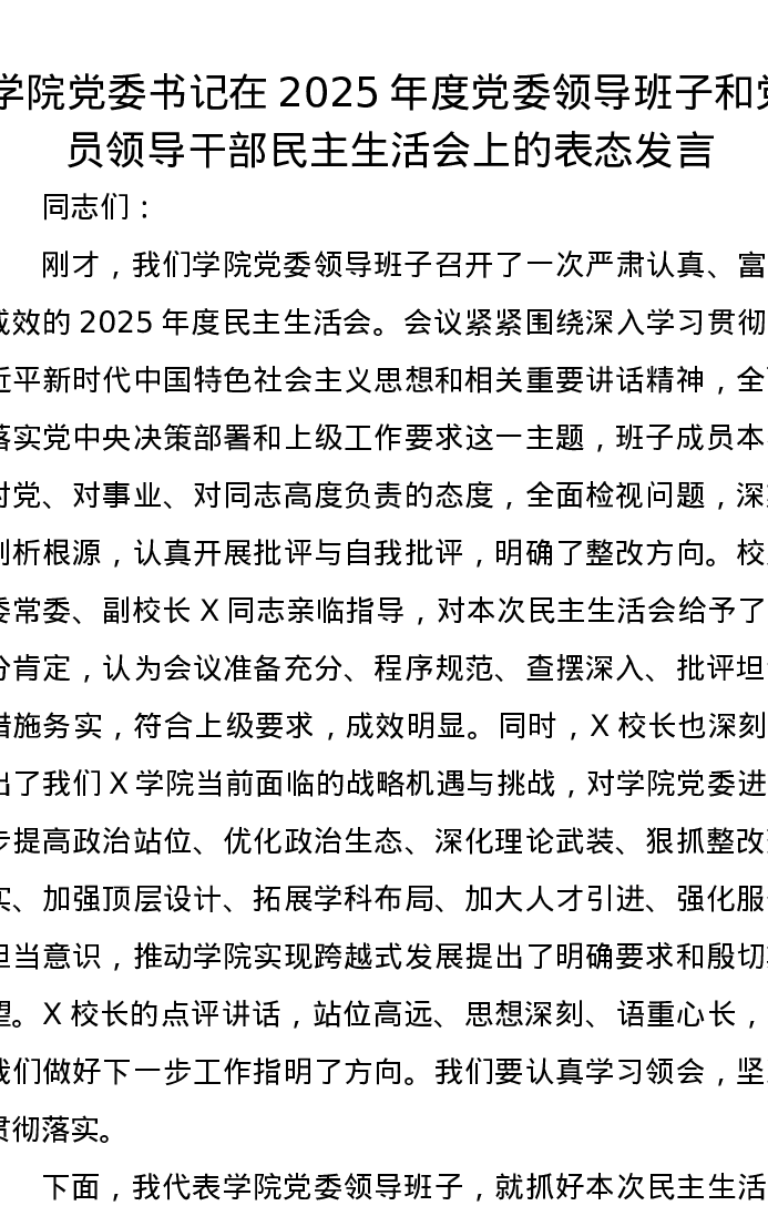 学院党委书记在2025年度党委领导班子和党员领导干部xxxxx上的表态发言