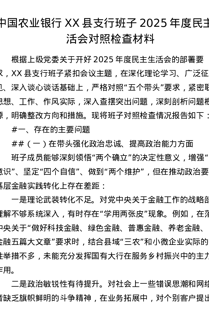 银行XX县支行班子2025年度xxxxx对照检查材料(5389字)