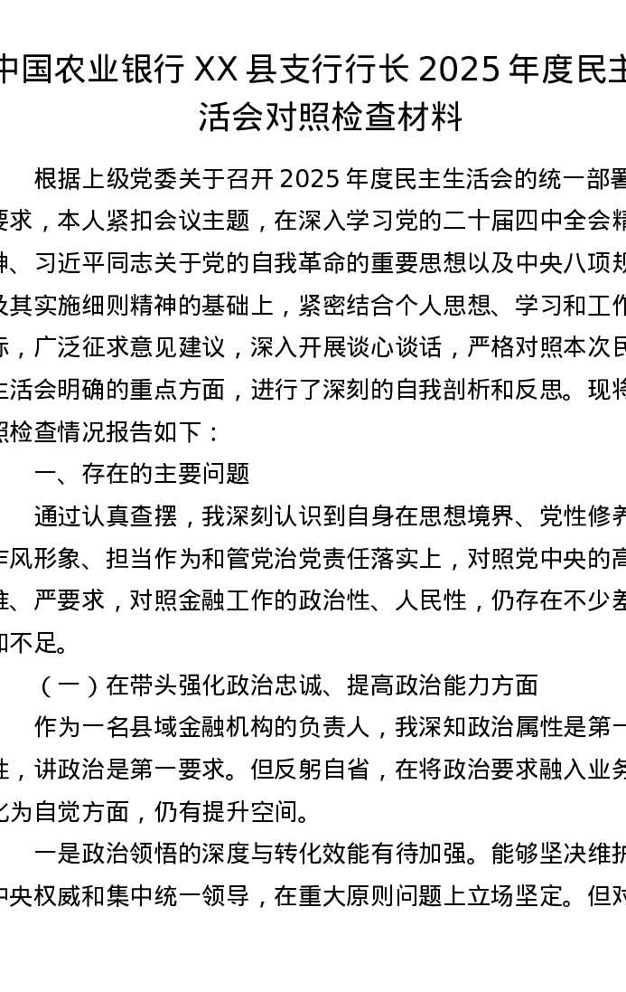 银行XX县支行行长2025年度xxxxx对照检查材料(6892字)