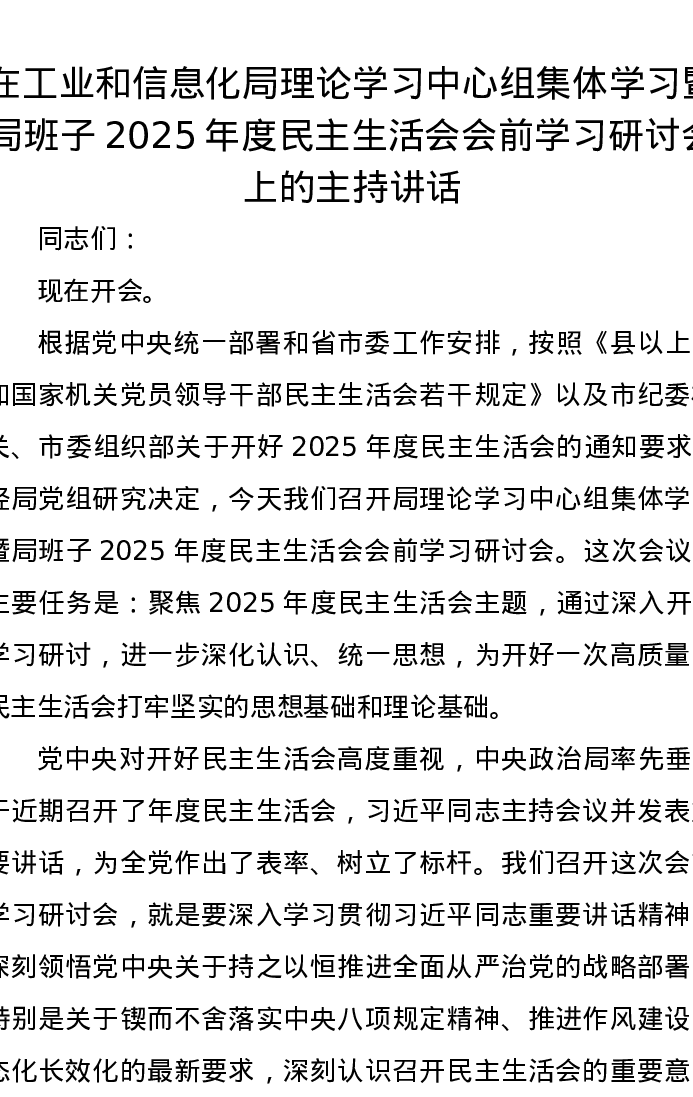 在工业和信息化局理论学习中心组集体学习暨局班子2025年度xxxxx会前学习研讨会上的主持讲话