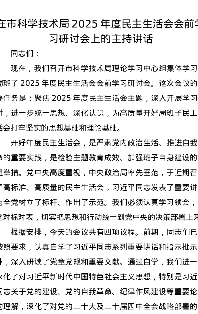 在市科学技术局2025年度xxxxx会前学习研讨会上的主持讲话