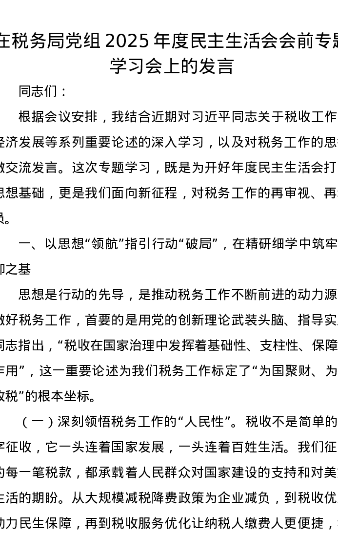 在税务局党组2025年度xxxxx会前专题学习会上的发言
