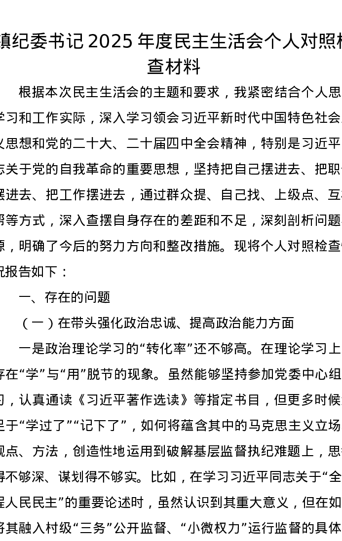 镇纪委书记2025年度xxxxx个人对照检查材料