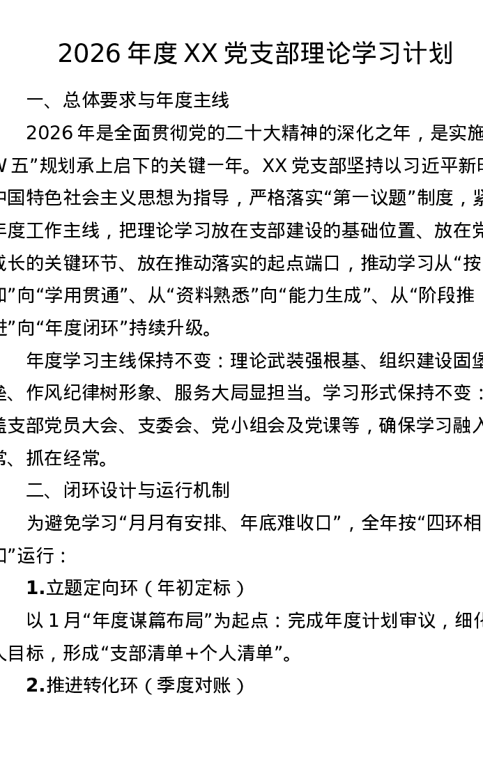 2026年度XX党支部理论学习计划(附表格)