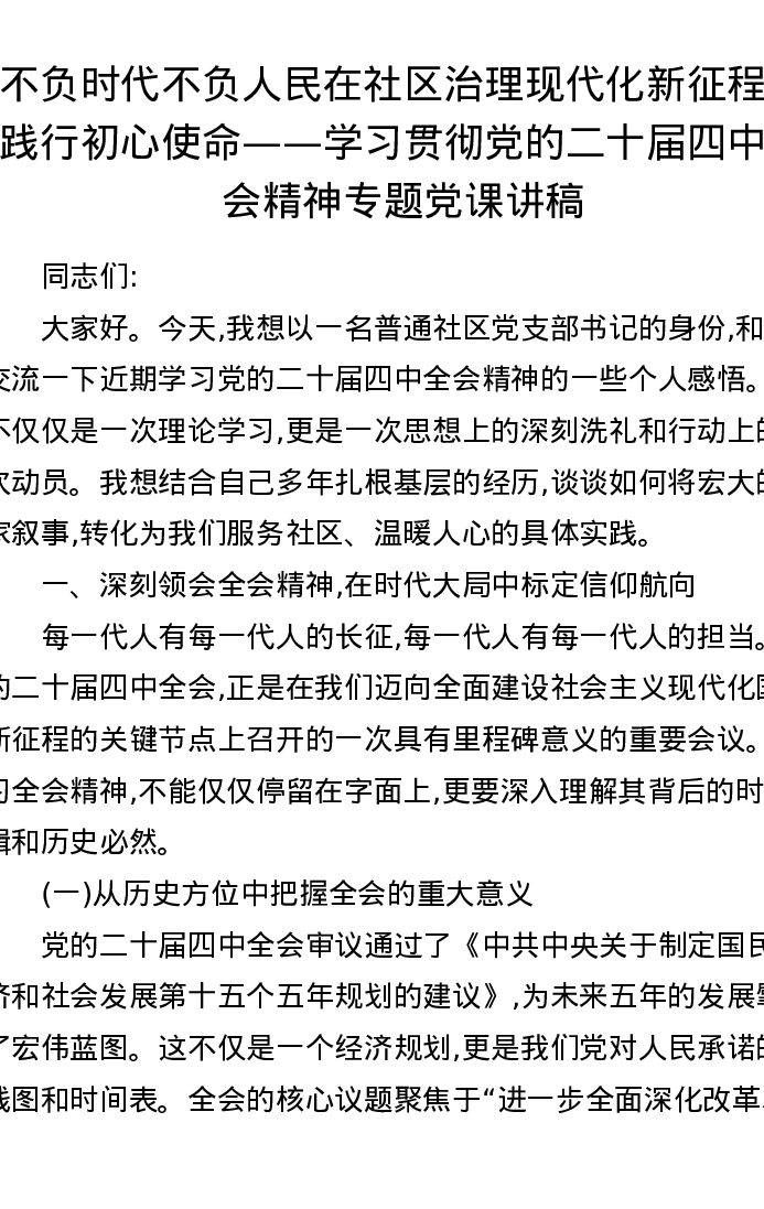 不负时代不负人民在社区治理现代化新征程上践行初心使命——学习贯彻党的二十届四中全会精神专题党课讲稿